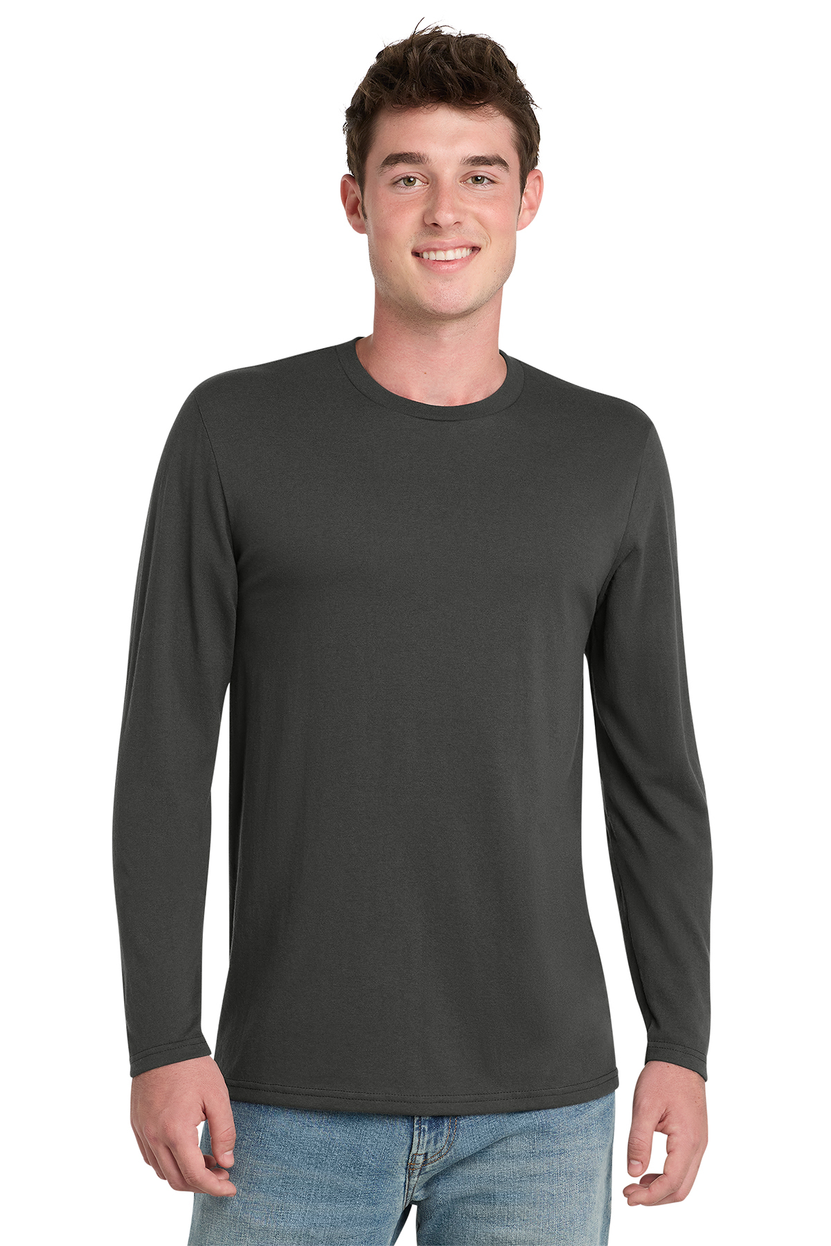 4.5-ounce, 50/37/13 poly/cotton/rayon 1×1 rib knit neck Shoulder to shoulder taping Double-needle open hem sleeve cuffs Tear-away label