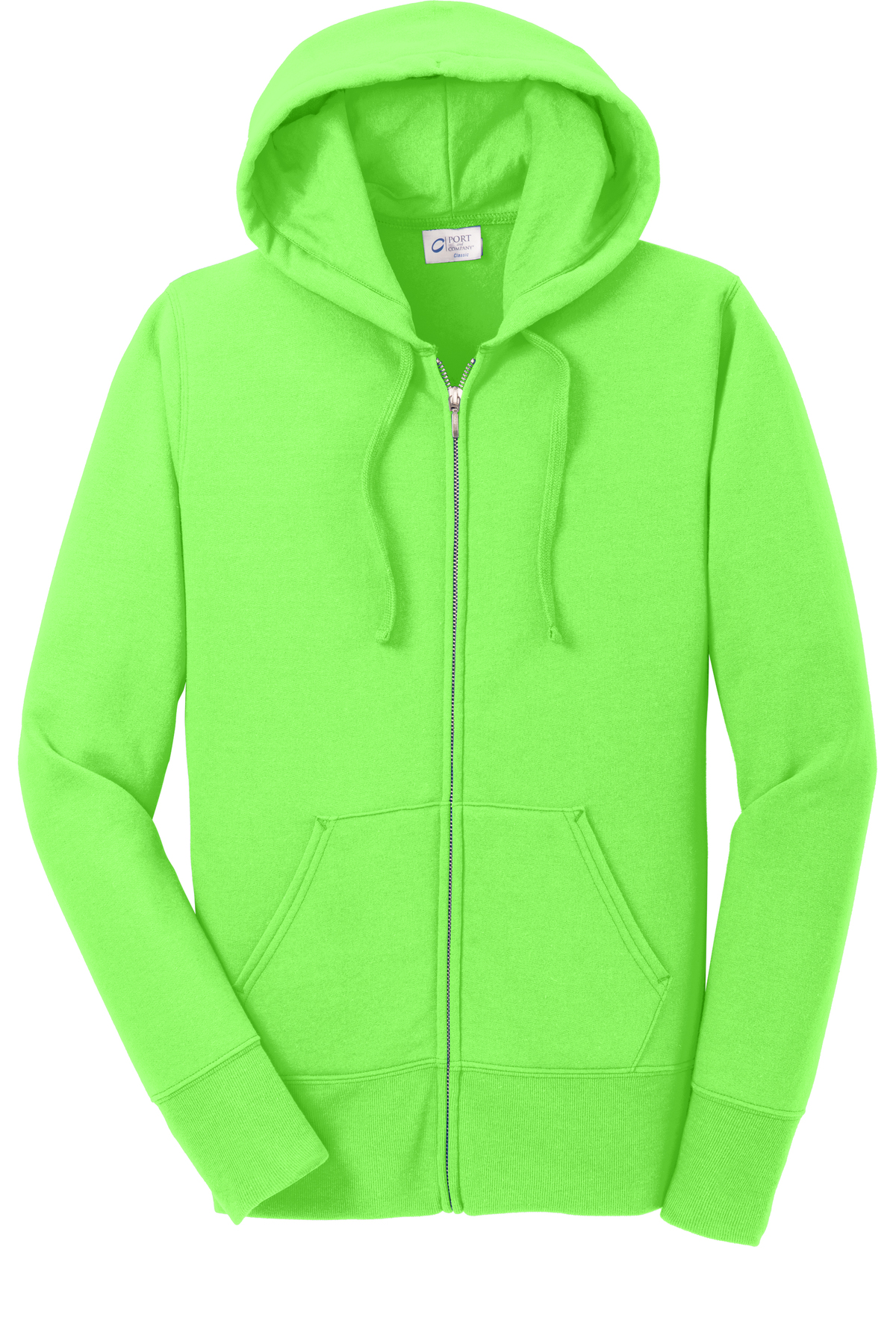 7.8-ounce, 50/50 cotton/poly fleece Air jet yarn for softness Two-ply hood with dyed-to-match drawcords Side seamed with a contoured body for a feminine fit YKK metal zipper Front pockets Tear-away label