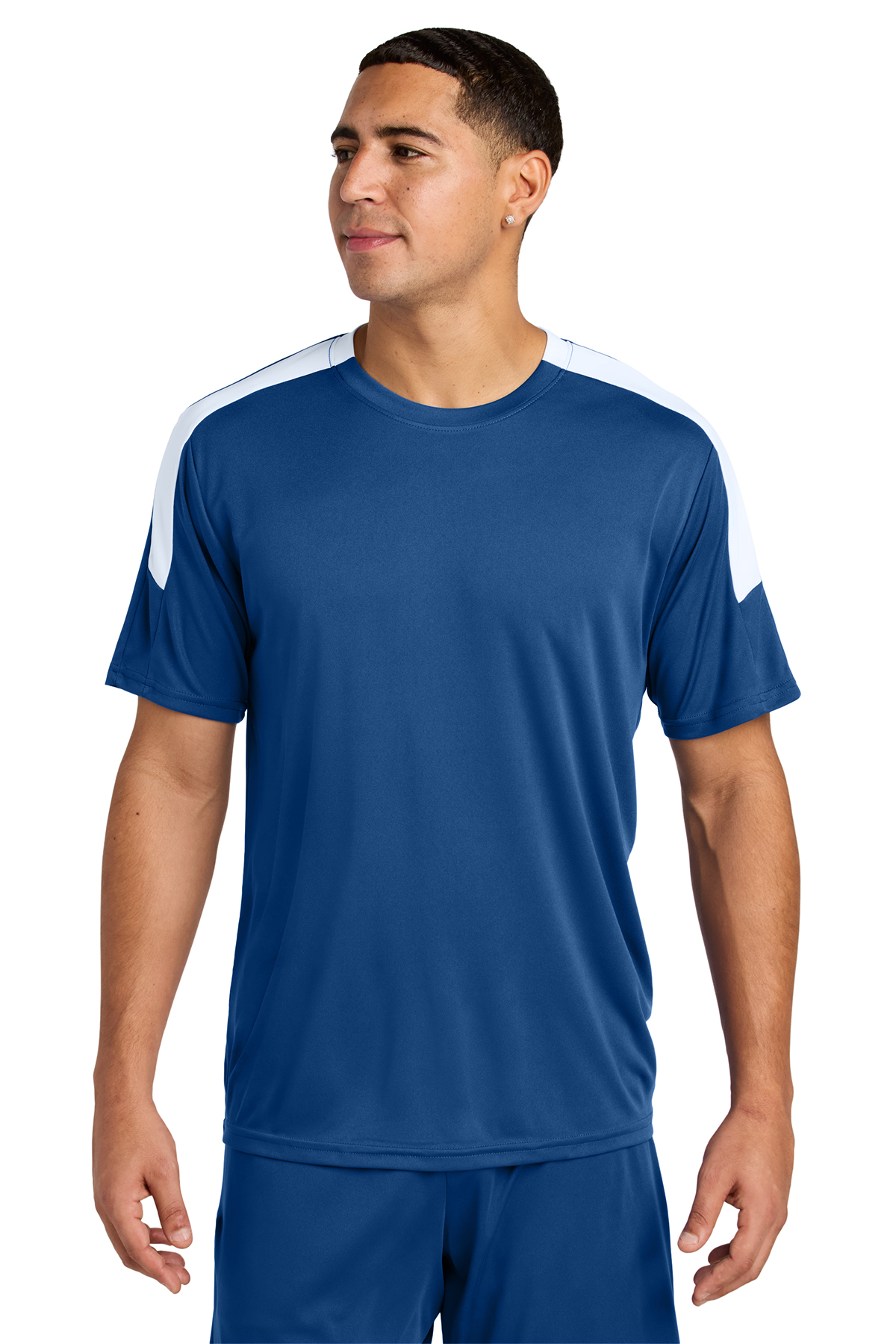 3.8-ounce, 100% poly interlock with PosiCharge® technology UPF rating of 30+ Tear-away label Contrast colorblocking on shoulders