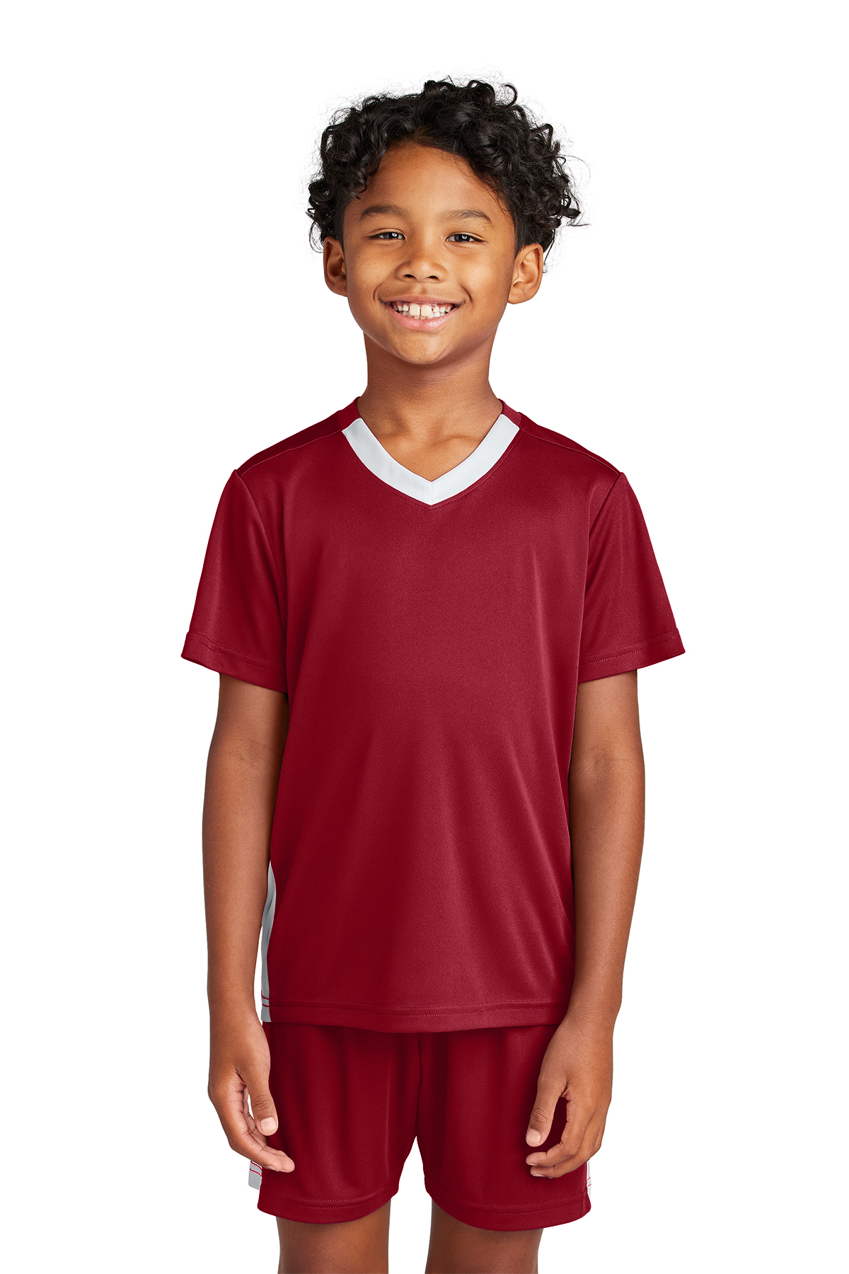 3.8-ounce, 100% poly interlock with PosiCharge® technology UPF rating of 30+ Tear-away label Athletic V-neck Contrast colorblocking at neck and side